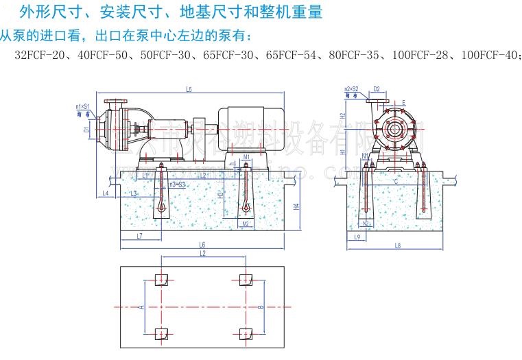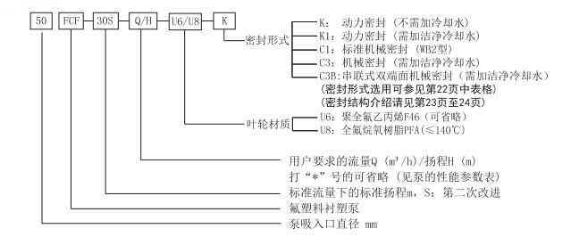 一、概述 FCF系列氟塑料襯塑泵是一種單級、單吸離心泵,其泵體及前后泵蓋由金屬外殼內(nèi)襯氟塑料(F46)、葉輪由金屬嵌件外包氟塑料(F46)壓制成型,軸封則采用機械密封和動力密封等多種密封形式。該泵具有結(jié)構(gòu)簡單、耐腐蝕性能強、耐溫高等特點。主要用于化工、冶煉、化纖、鈦白、稀土、稀有金屬、農(nóng)藥、磷復肥、檸檬酸、無機鹽、造紙、環(huán)保、食品及污水處理等行業(yè),是輸送清潔或含有少量顆粒的強酸、強堿及有機溶劑等強腐蝕介質(zhì)的理想設備。 二、型號說明