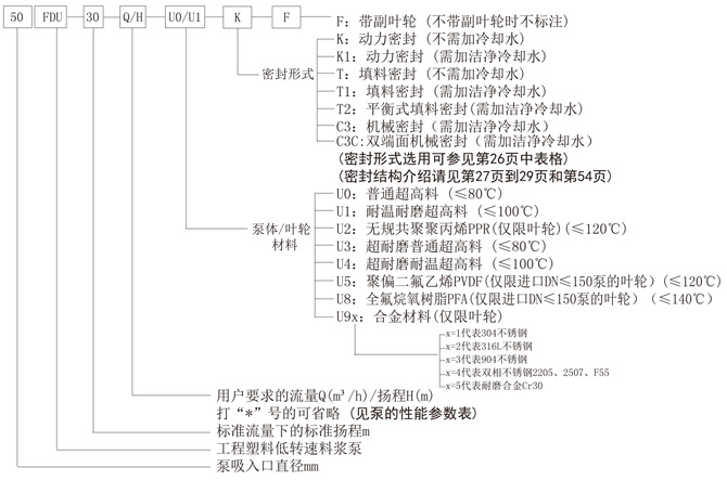 一、概述 FDU系列工程塑料低轉(zhuǎn)速料漿泵是在吸收我公司FUH系列臥式泵技術(shù)的基礎(chǔ)上,結(jié)合國內(nèi)低轉(zhuǎn)速離心泵結(jié)構(gòu)的優(yōu)點精心設(shè)計而成,與FUH系列高速臥式泵相比有以下顯著特點: 該系列泵過流部件采用超高分子量聚乙烯(UHMWPE)制作,其耐腐蝕性能優(yōu)良、耐磨性能優(yōu)異(居各種塑料之首)、耐沖擊性能強。泵的密封分別采用機械密封、動力密封和填料密封等多種密封形式,既可以輸送含固體顆粒的料漿和含各種雜質(zhì)的污水,也可以輸送酸堿清液,在輸送含大量顆粒的氫氟酸、氟硅酸、磷酸、混酸、電解液、鹽酸、稀硫酸、濃堿等方面顯示了無比優(yōu)越的性能。 二、用途 FDU系列泵主要應(yīng)用于各類酸、堿、鹽、油類、食品飲料、酒類等液體。具體應(yīng)用于化工行業(yè)的各種硫酸、鹽酸、堿類、油類等料漿或清液崗位;有色冶煉行業(yè)特別是鉛、鋅、金、銀、銅、鈷、鎢、稀土等濕法冶煉中的各種酸液、礦漿、料漿(壓濾機配用)、電解液、污水等介質(zhì);化肥行業(yè)中稀酸(酸洗工藝用)、母液、氫氟酸、氟硅酸、海水及磷酸料漿等介質(zhì);水處理、環(huán)保行業(yè)中的各類污水(食品污水、電鍍污水、皮革污水、制藥污水、造紙污水、紡織污水、電子污水等)及脫硫(石膏法和氨法);鋼鐵業(yè)酸洗系統(tǒng)的硫酸、鹽酸崗位;鈦白粉行業(yè)中的酸解、沉降、冷凍、水解、水洗、鹽處理;檸檬酸的發(fā)酵、中和、壓濾、廢水等崗位以及黑色金屬錳業(yè)等。此外,該系列泵不僅可以替代以上行業(yè)中的國內(nèi)同類金屬與非金屬產(chǎn)品,也是進(jìn)口設(shè)備國產(chǎn)化的優(yōu)選產(chǎn)品,特別適用于含固量高的壓濾機上使用。 三、型號說明